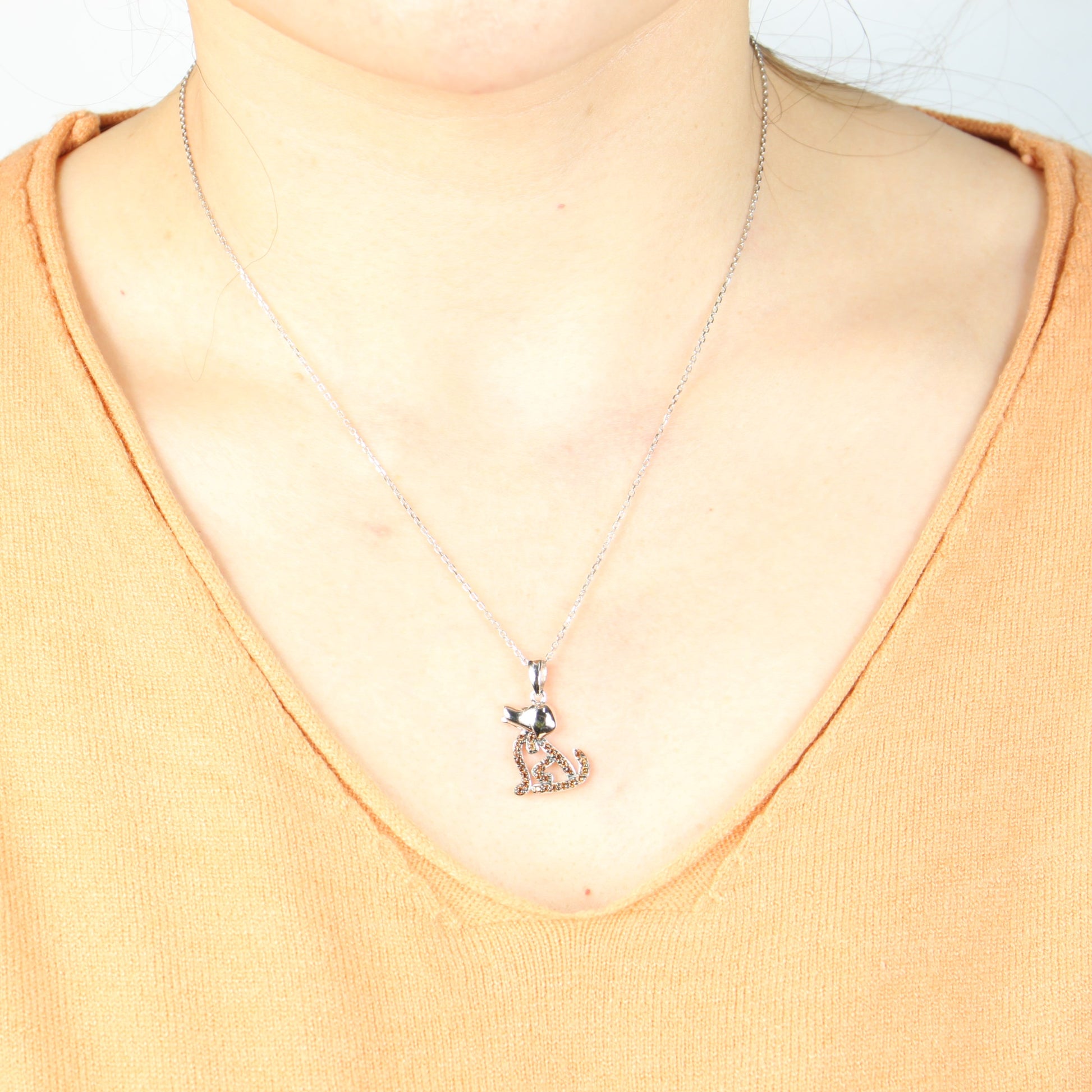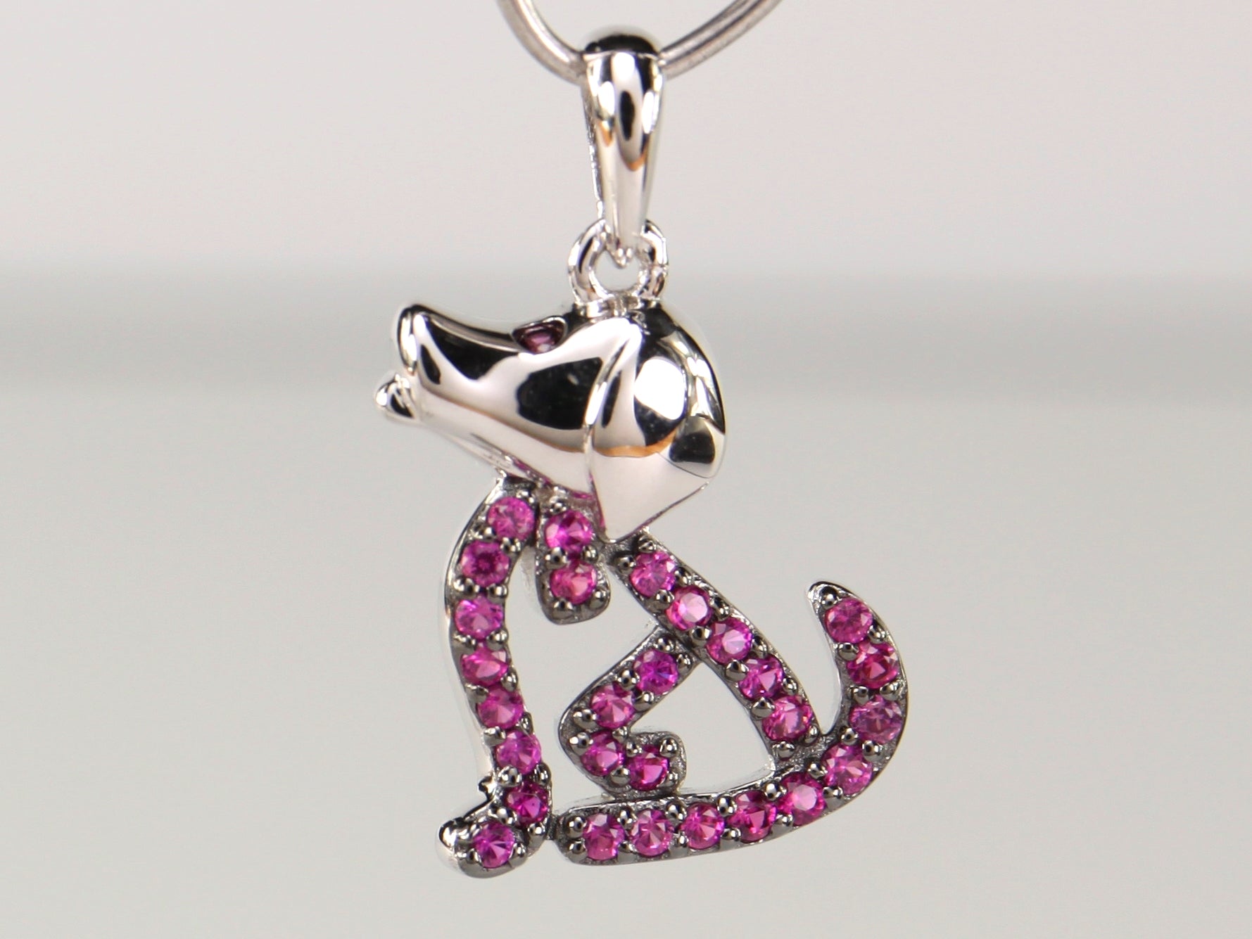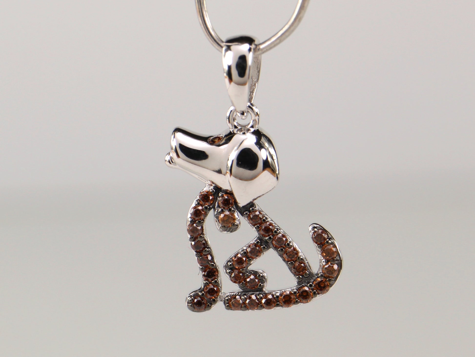 925/1000 Solid Silver With White Rhodium Plated Pink Brown Black Stones Puppy Dog 18 inches (16"+1"+1") C-Link Chain Necklace