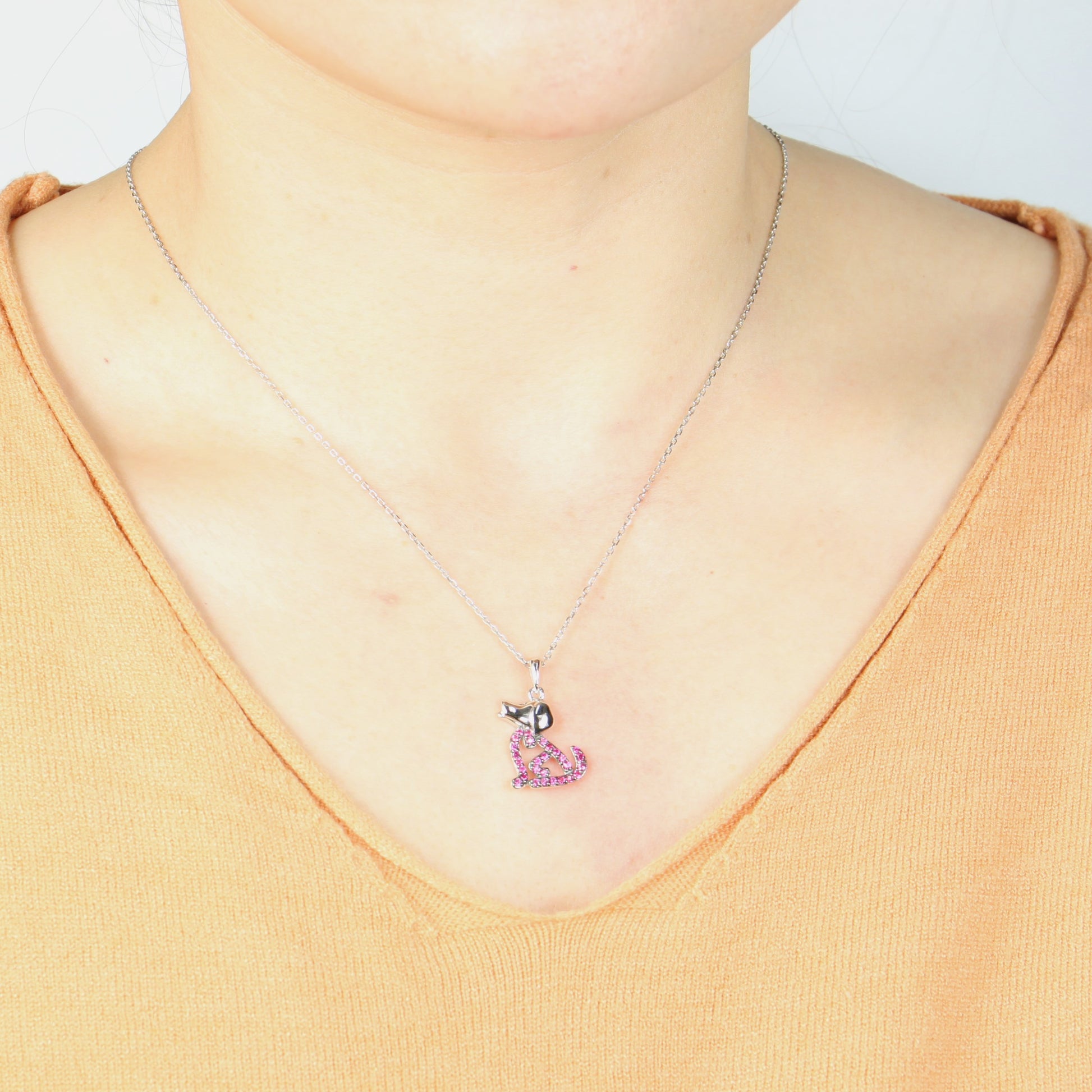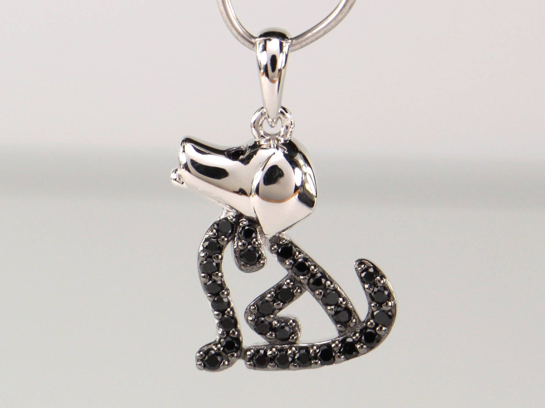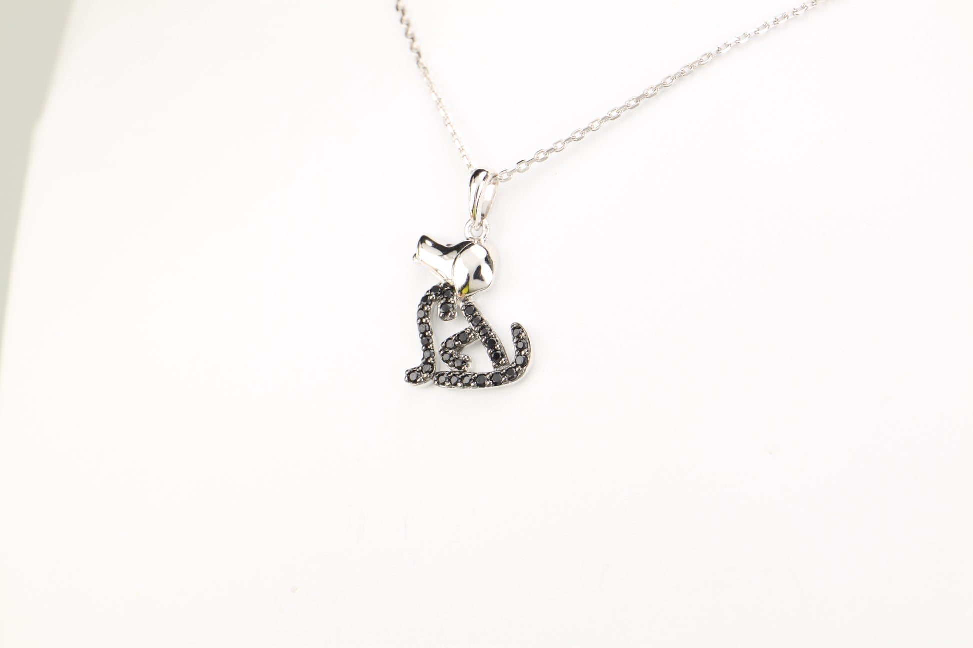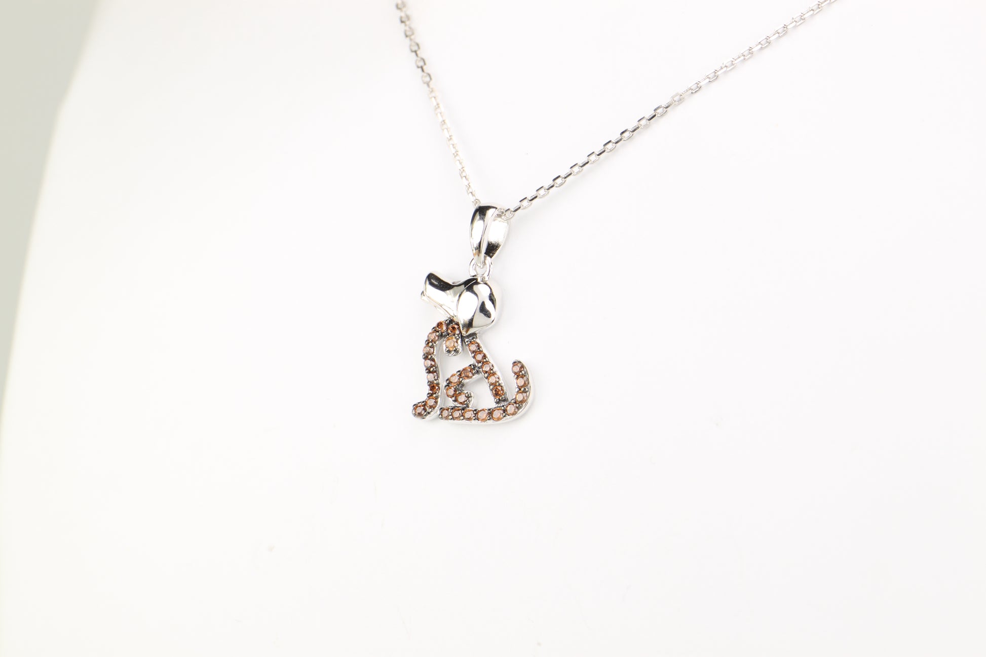 925/1000 Solid Silver With White Rhodium Plated Pink Brown Black Stones Puppy Dog 18 inches (16"+1"+1") C-Link Chain Necklace