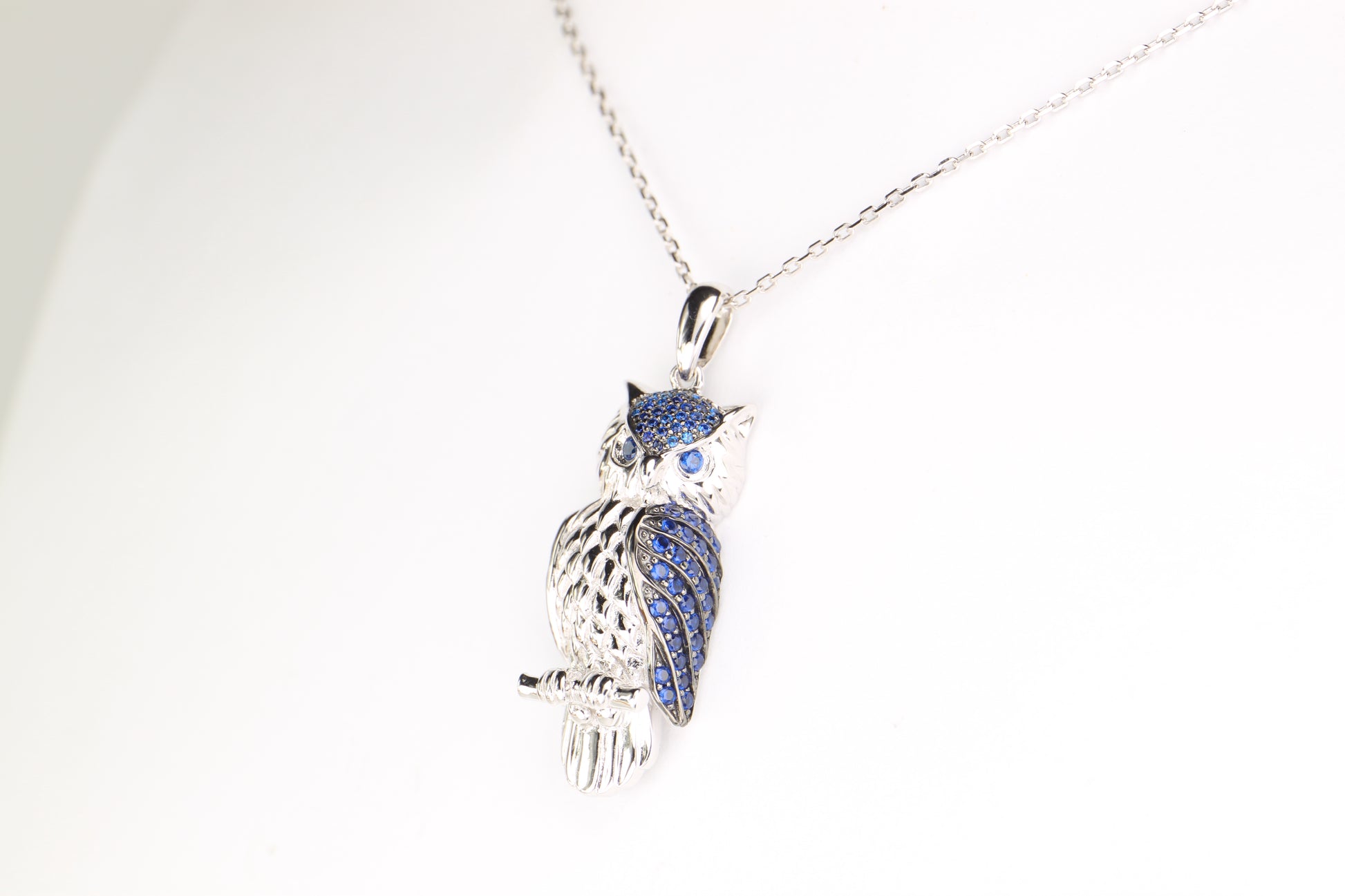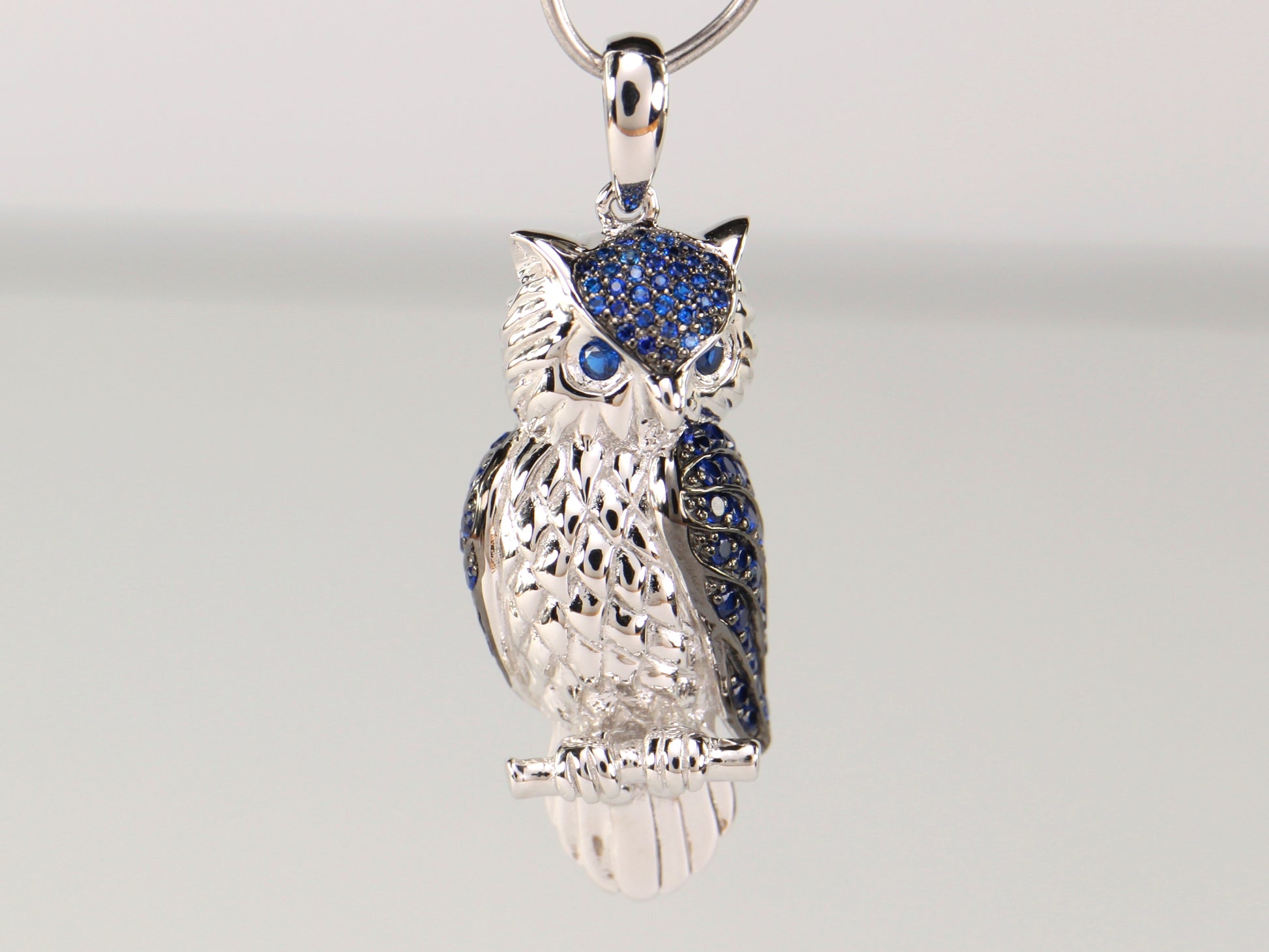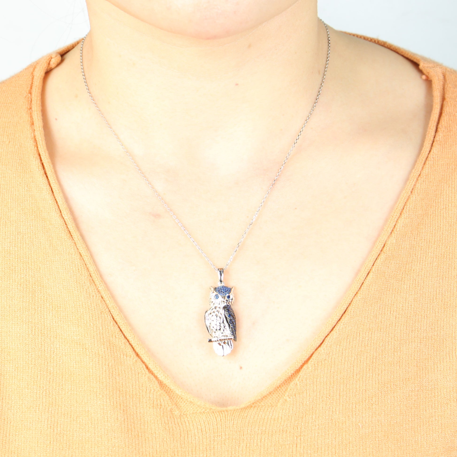 925/1000 Solid Silver With White Black Rhodium Plated Blue Pink Stones Owl 18 inches (16"+1"+1") C-Link Chain Necklace