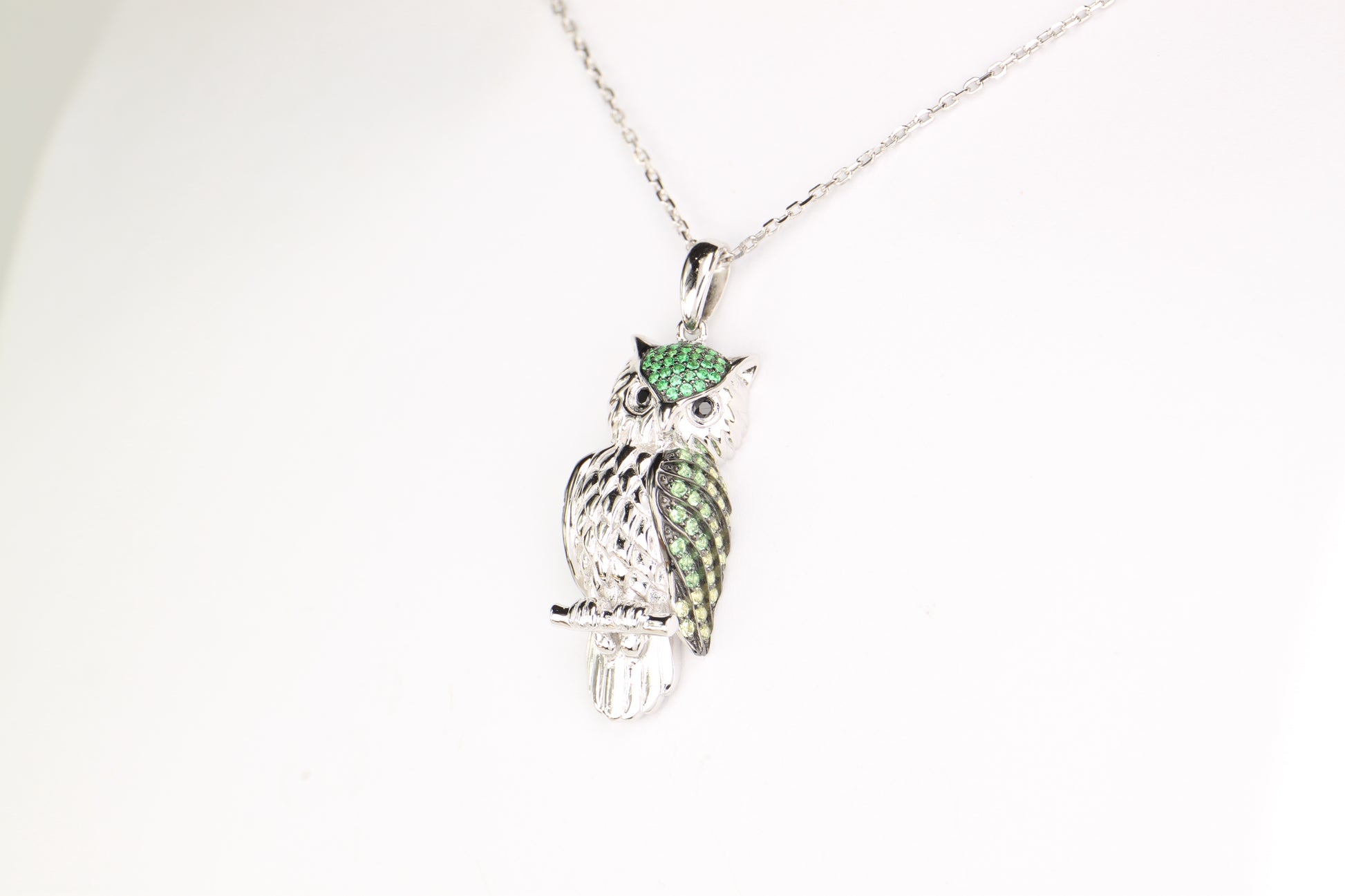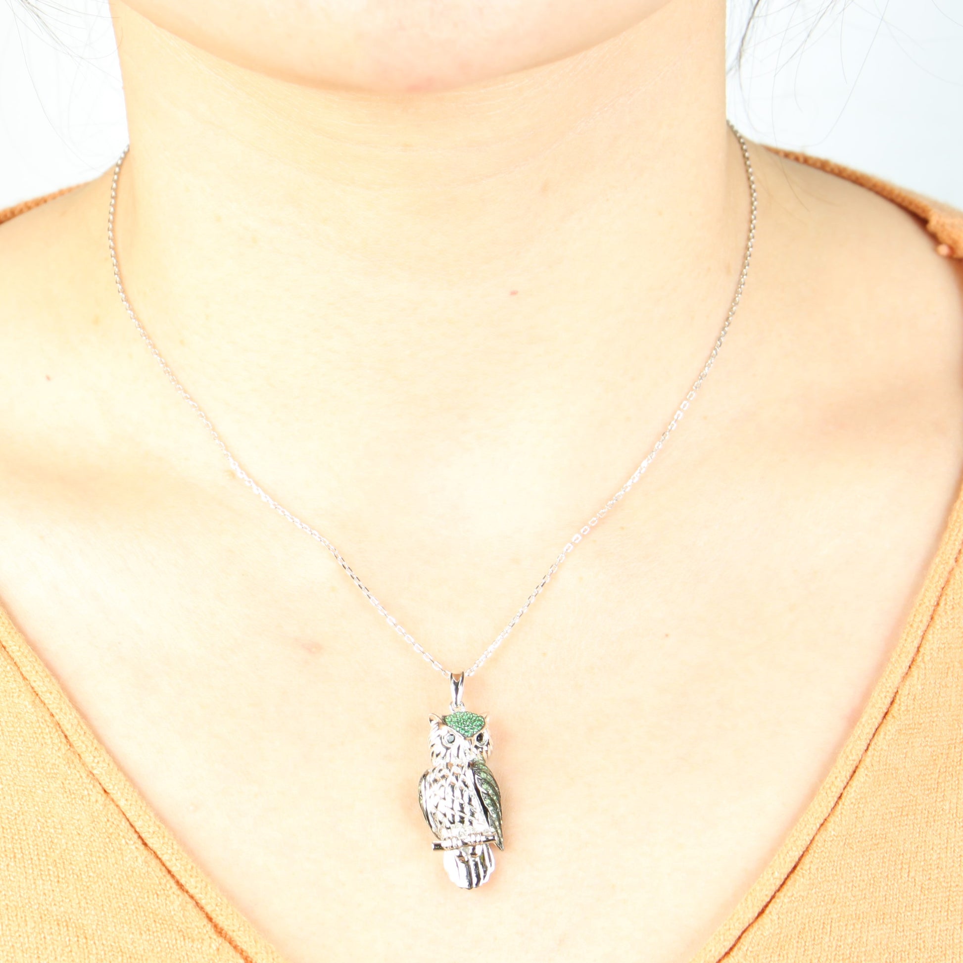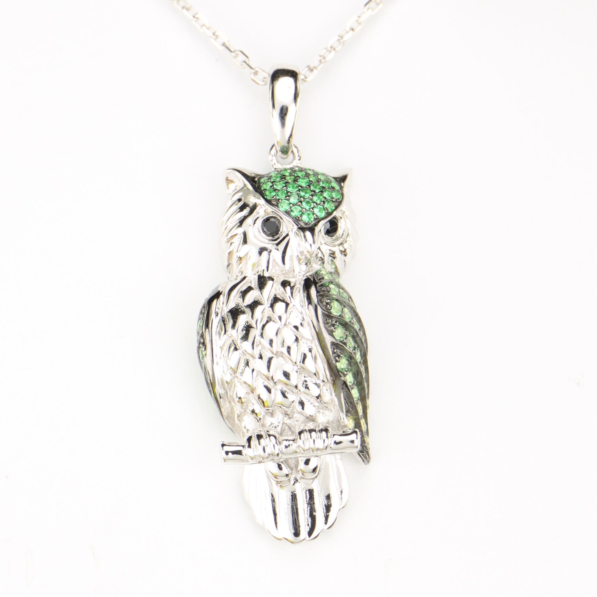 925/1000 Solid Silver With White Black Rhodium Plated Blue Pink Stones Owl 18 inches (16"+1"+1") C-Link Chain Necklace